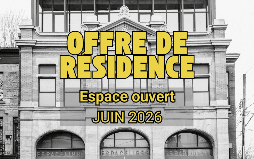 Pour une troisième édition, Espace Libre ouvre ses portes à la relève et offre des heures de travail en studio! Déposez votre candidature avant le vendredi 24 avril pour bénéficier de 8h de résidence gratuite dans le cadre d'Espace ouvert.